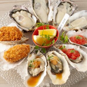 オイスタープレートは豪華な10ピースの牡蠣を一度に楽しめる贅沢な一皿です。新鮮な生牡蠣4ピースに、2種類の味わいを楽しめるグリルオイスター各2ピース、そしてサクサクの牡蠣フライ2ピースを盛り合わせました。一度に多彩な牡蠣の美味しさを堪能できる、至福のオイスタープレートをぜひお楽しみください。皆様のご来店を、心よりお待ち申し上げております。
